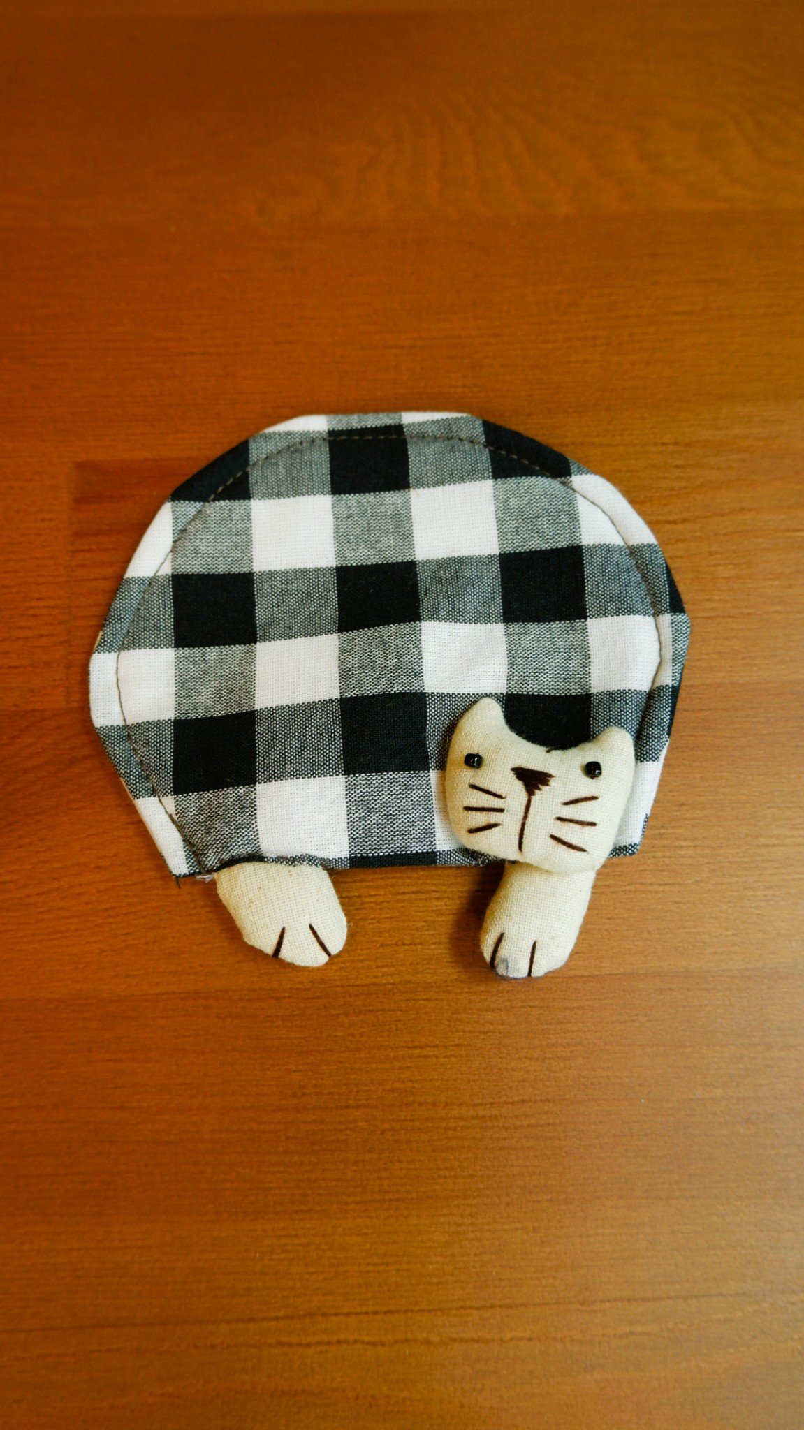 ที่รองแก้วผ้าลายตารางขาวดำ แต่งแมว
