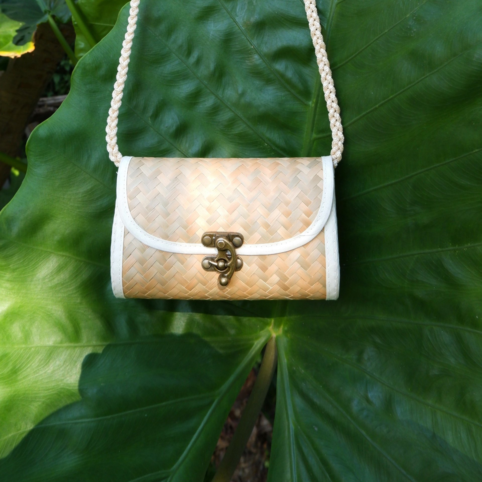 กระเป๋าสานสะพายข้าง ตะขอเกี่ยว ทรงยาว ขอบขาว