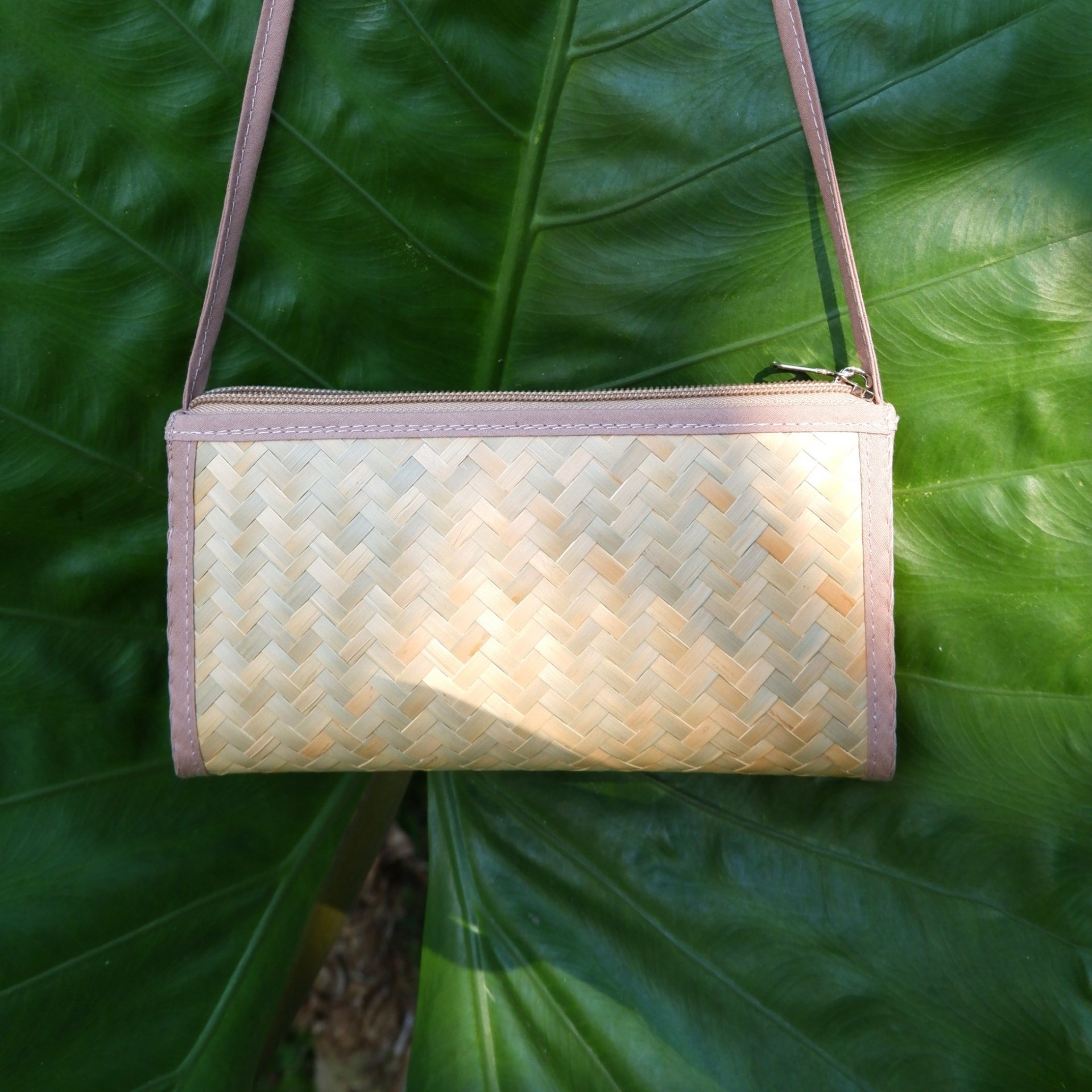 กระเป๋าสานสะพายข้าง ตะขอเกี่ยว ทรงยาว ขอบม่วง